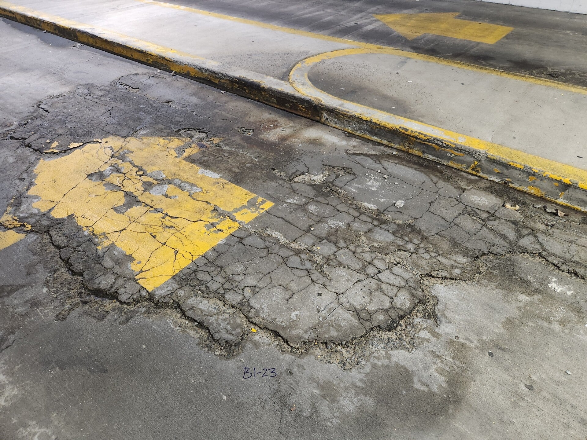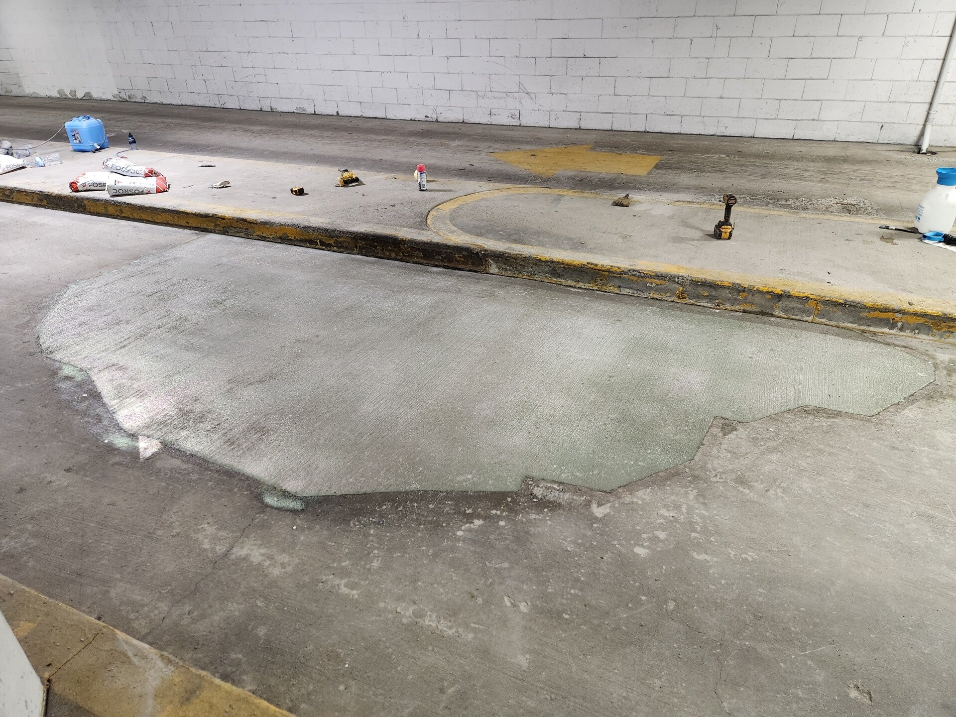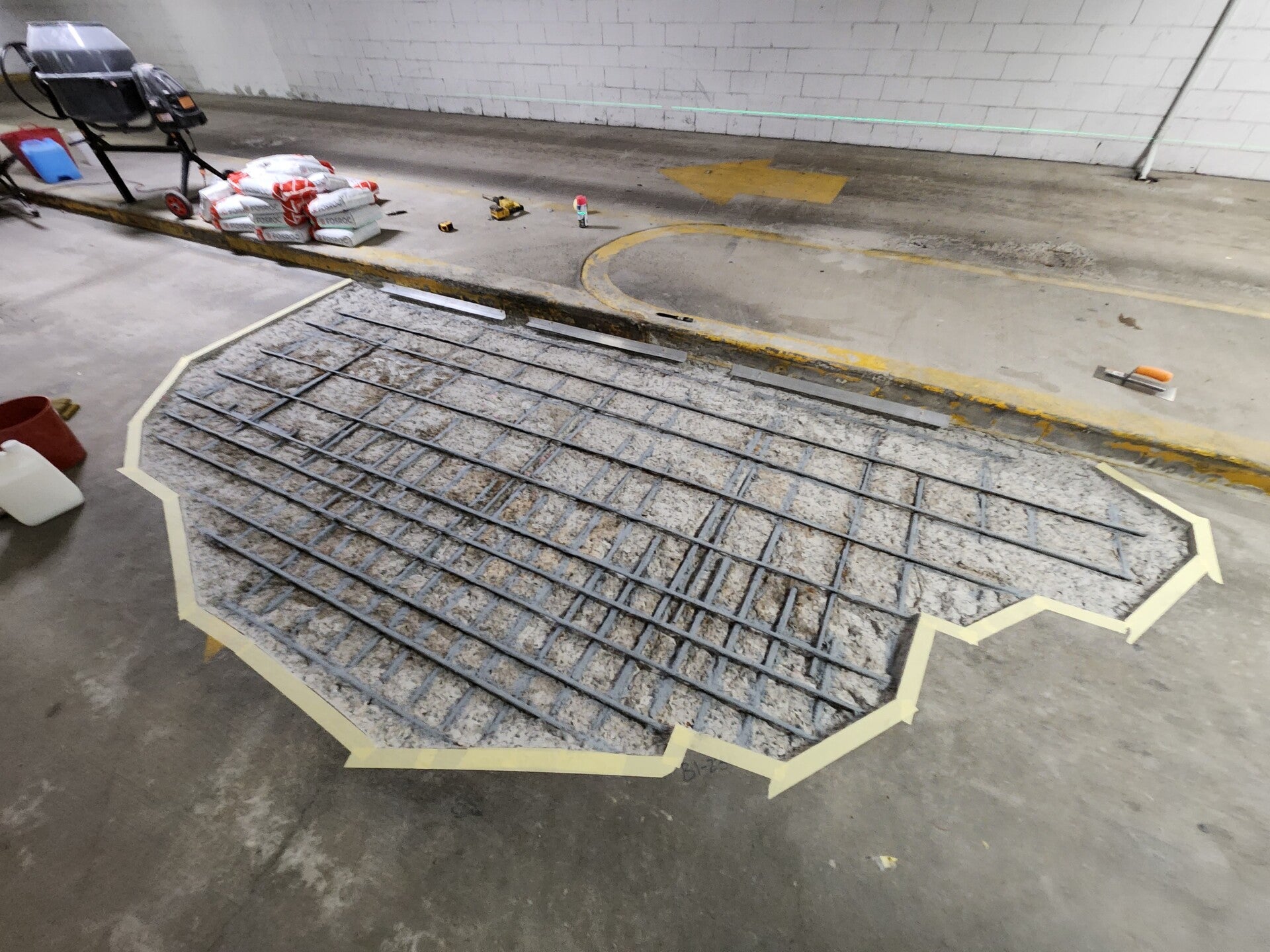 The first stage of the repair is to perform a "tap test", this tap test allows an experienced tedchnician to audibly identify the perimeter of the debonded (or "popped") concrete. Which he marks out in a series of straight lines.